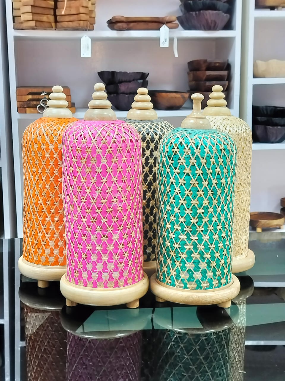 Illuminate your space with the natural beauty of this handcrafted bamboo tabletop decorative light. Designed to cast a soft, ambient glow, it blends traditional craftsmanship with modern aesthetics. Perfect for creating a cozy atmosphere in living rooms, bedrooms, or workspaces, this sustainable piece is both functional and artistic—bringing warmth, texture, and a touch of nature to your decor. available in black, orange, pink, blue and natural