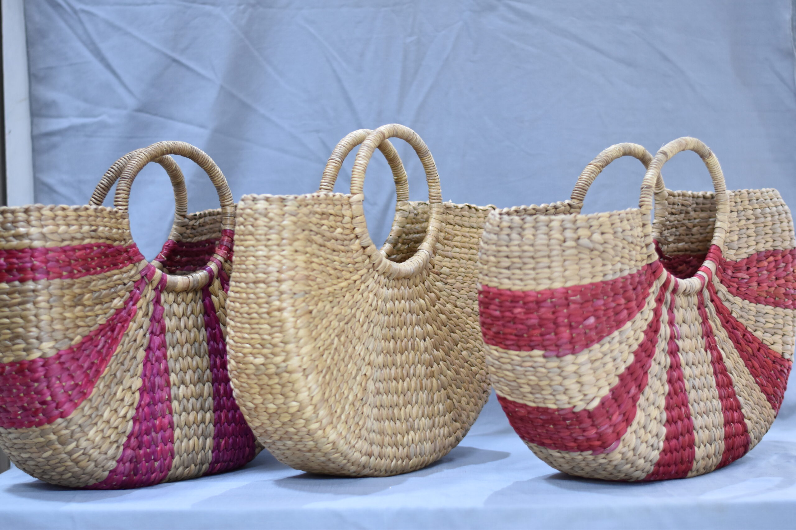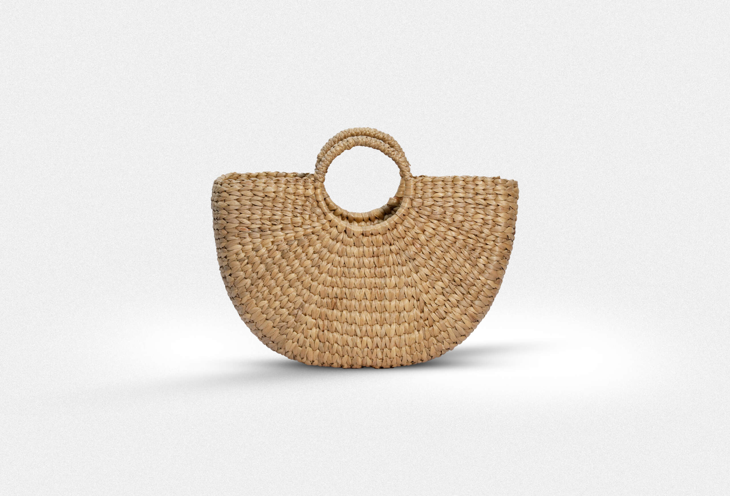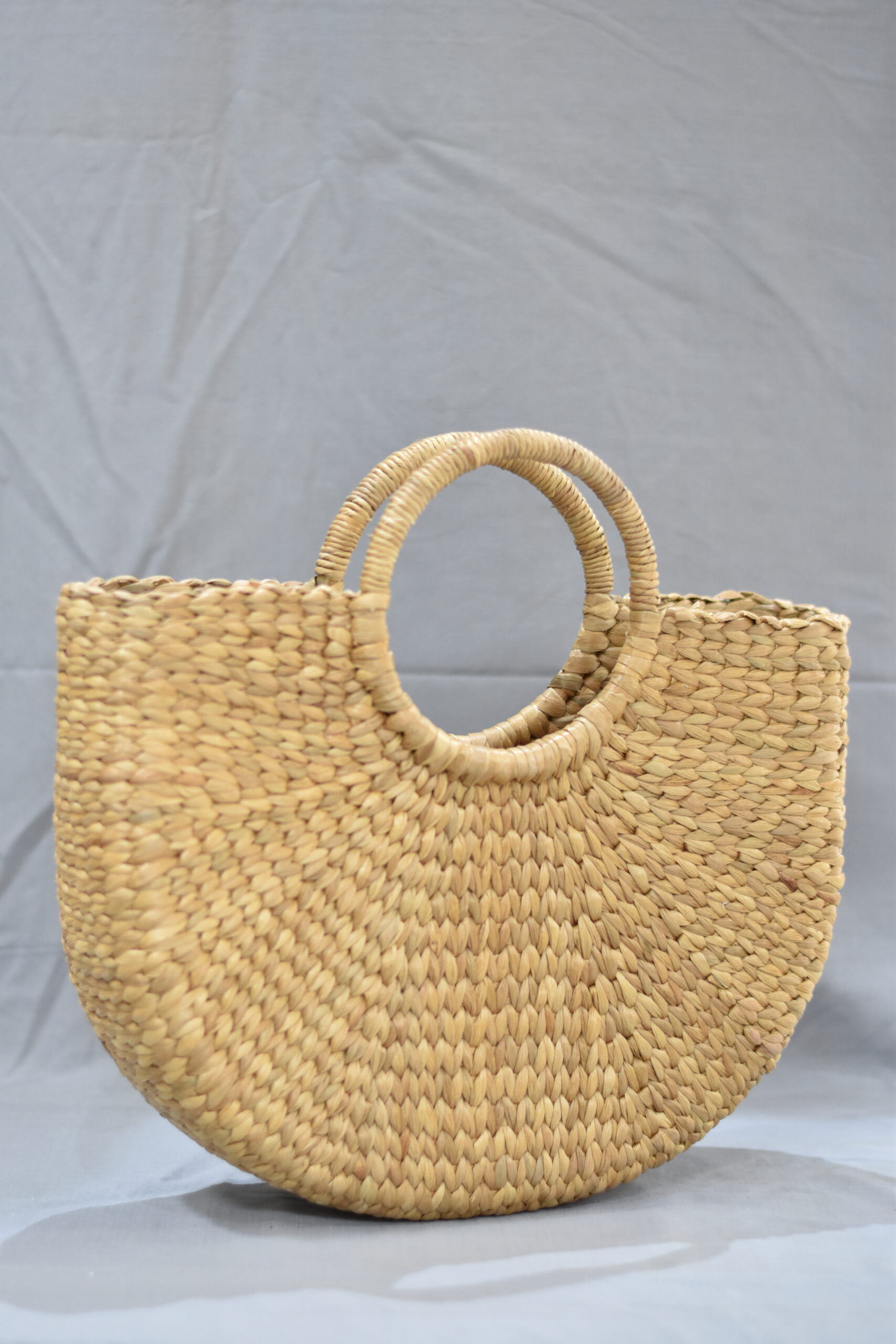 This elegant ladies’ handbag is crafted from eco-friendly water hyacinth, featuring a half-moon shape and sturdy circular handles. Its natural woven texture makes it an ideal accessory for beach days, casual outings, or a laid-back summer style.